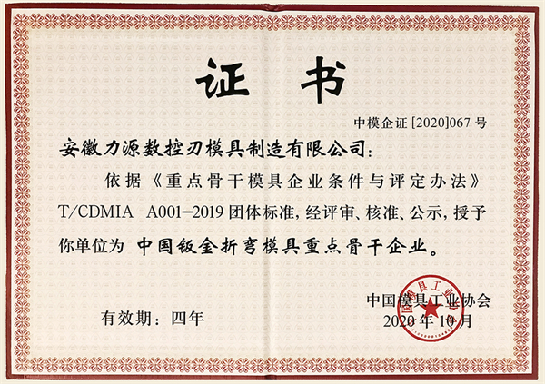我公司榮獲“中國(guó)鈑金折彎模具重點(diǎn)骨干企業(yè)”稱號(hào)