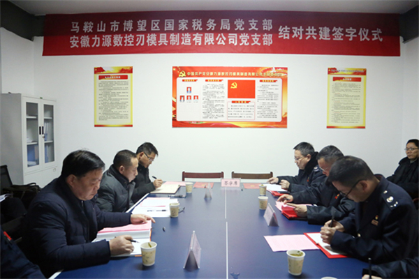 2018年1月4日下午,中共馬鞍山市博望區(qū)國家稅務局黨支部與中共安徽力源數控刃模具制造有限公司黨支部結對共建簽字儀式暨第一次聯席會議在力源公司“黨員活動室”隆重舉行。博望國稅黨支部書記、局長劉正發(fā)同志攜支部領導、班子成員會同力源公司黨支部書記張先進、董事長張迎年等參加會議,博望鎮(zhèn)黨委委員王武春同志參加會議。