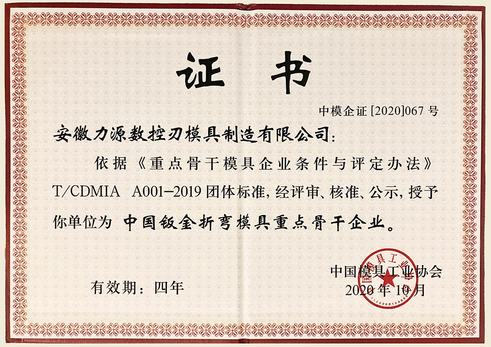 中國(guó)鈑金折彎模具重點(diǎn)骨干企業(yè)證書